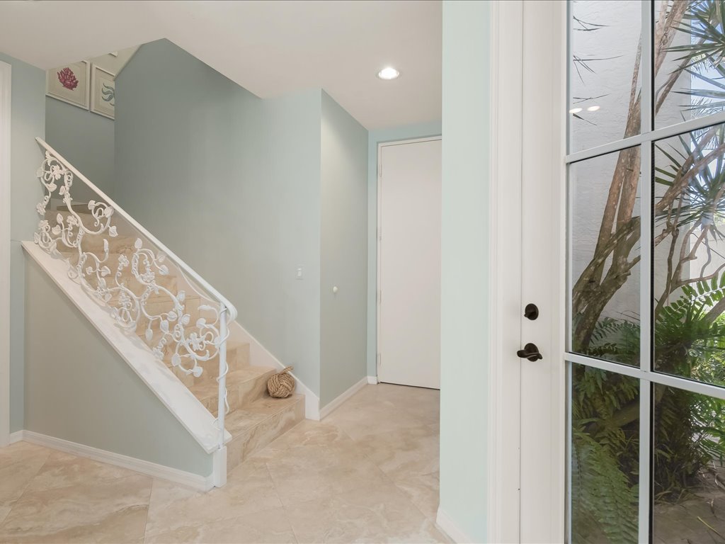 The interior features a beautifully renovated kitchen (2018) with Quartzite countertops, stainless steel appliances, and an inviting breakfast bar that opens to a bright dining space. The living area is warm and polished with French doors and classic coastal finishes. Upstairs, new 100% wool carpeting (2023) leads to a spacious primary suite with a private balcony overlooking the courtyard and a luxurious bath with dual sinks, walk-in shower, and soaking tub.